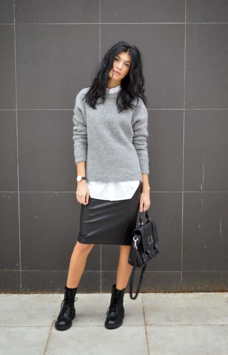 Следующий вариант — это свитер и тонкая юбка. Такое сочетание прекрасно подчеркивает хрупкость прекрасной половины человечества и добавляет женственности. Лучше всего, если свитер будет объемным, а струящаяся юбка иметь длину миди. Но чтобы не потерять пропорции и не казаться бесформенным нечто, заправьте пуловер в юбку илизакрепите на талии тонкий поясок. Обувь на каблуке станет «изюминкой» осеннего образа.